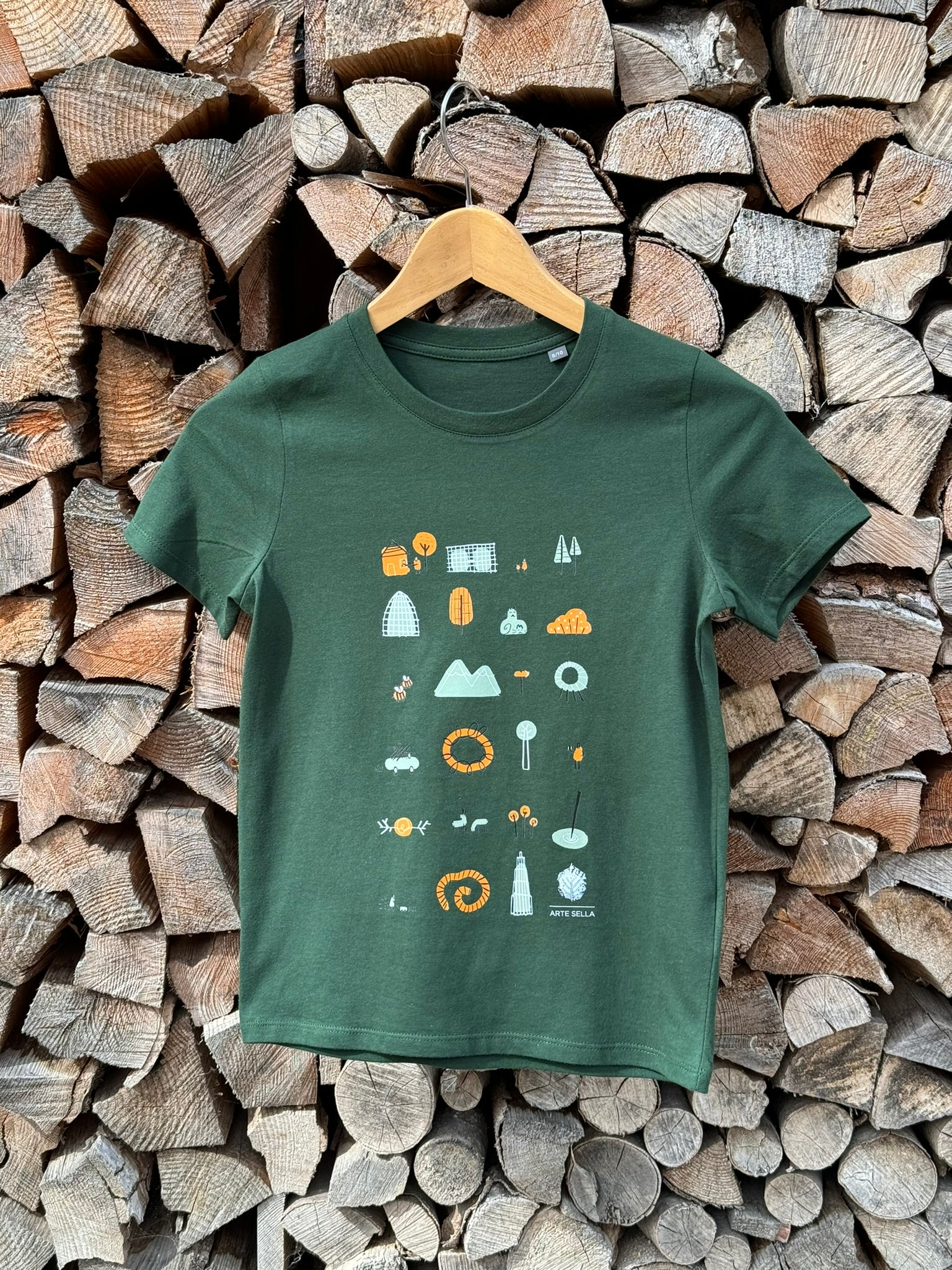 La nuova maglietta per bambino e bambina, disegnata da Adriano Siesser, che ritrae le opere, le persone e la natura di Arte Sella.